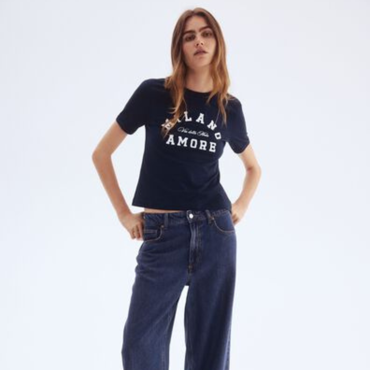 เสื้อยืดคอกลมแขนสั้นสีน้ำเงินเข้ม ทรงเข้ารูป พิมพ์ลายตัวอักษร “MILANO AMORE” สีขาวด้านหน้า