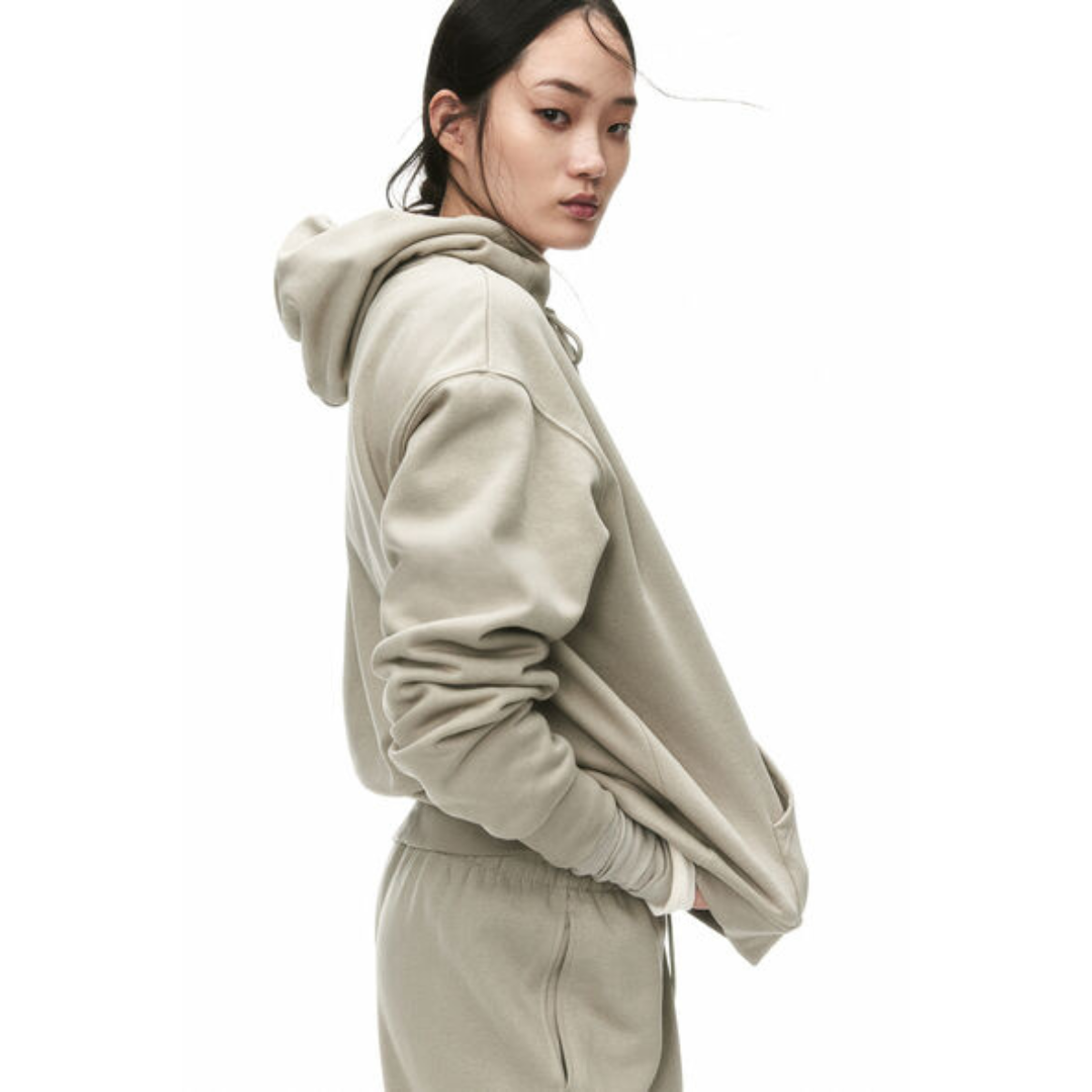 เสื้อฮู้ดดี้แขนยาวสีเบจ/เขียวอ่อน ทรงโอเวอร์ไซส์ พร้อมกางเกงวอร์ม/จ็อกเกอร์เข้าชุด