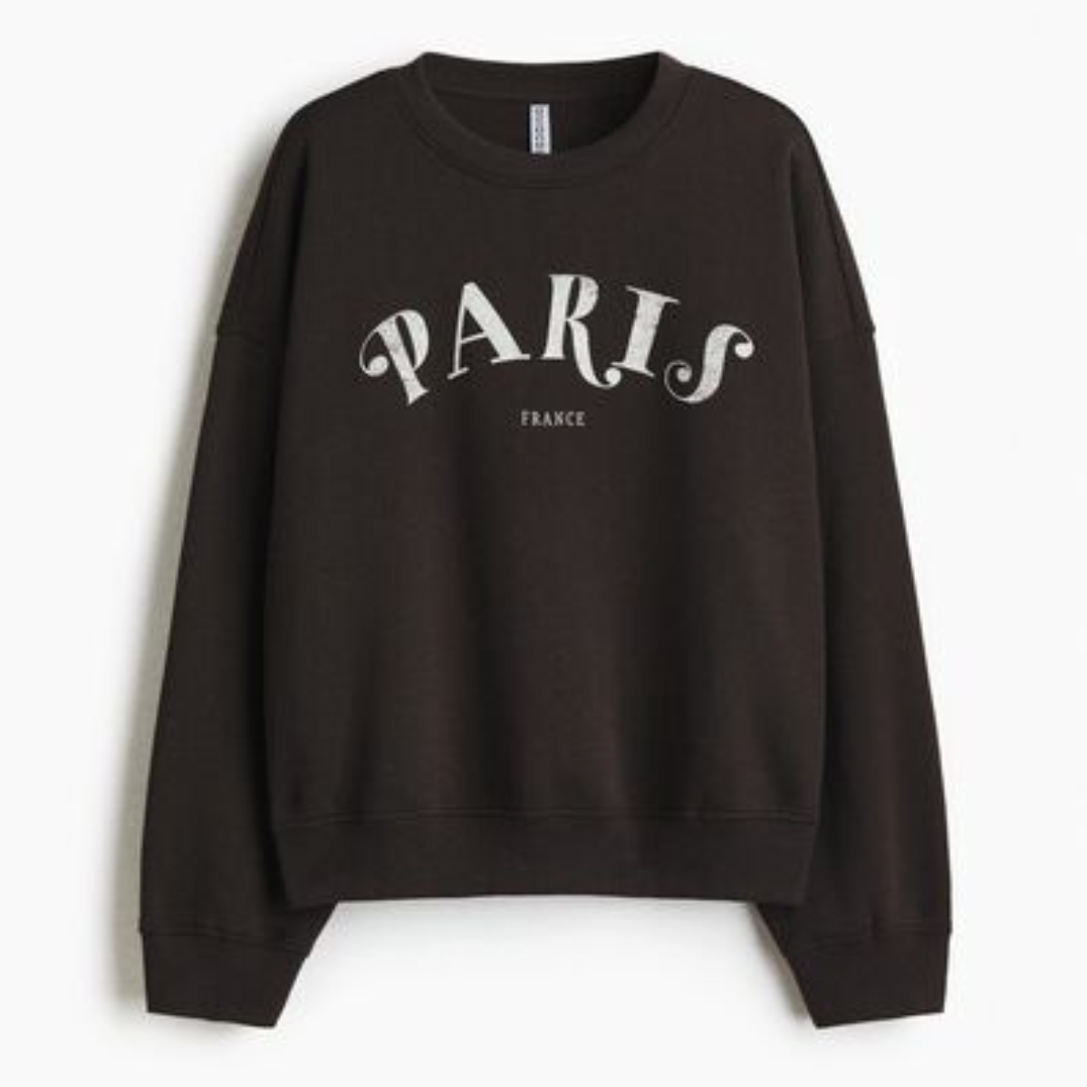 เสื้อสเวตเชิ้ตแขนยาวสีเข้ม (สีน้ำตาล/ดำ) ทรงโอเวอร์ไซส์ พิมพ์ลาย “PARIS FRANCE” คอเสื้อกลม